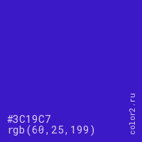 Цвет #3C19C7 в цветовой модели RGB обозначается тремя октетами (60, 25, 199) в десятичном формате и #3C19C7 в шестнадцатиричном (hex) формате, которые являются интенсивностью красного 60 (hex 3C), интенсивность зелёного 25 (hex 19) и интенсивность синего 199 (hex C7).