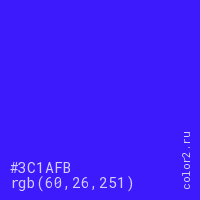 Цвет #3C1AFB в цветовой модели RGB обозначается тремя октетами (60, 26, 251) в десятичном формате и #3C1AFB в шестнадцатиричном (hex) формате, которые являются интенсивностью красного 60 (hex 3C), интенсивность зелёного 26 (hex 1A) и интенсивность синего 251 (hex FB).