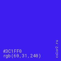 Цвет #3C1FF0 в цветовой модели RGB обозначается тремя октетами (60, 31, 240) в десятичном формате и #3C1FF0 в шестнадцатиричном (hex) формате, которые являются интенсивностью красного 60 (hex 3C), интенсивность зелёного 31 (hex 1F) и интенсивность синего 240 (hex F0).