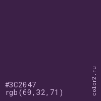 Цвет #3C2047 в цветовой модели RGB обозначается тремя октетами (60, 32, 71) в десятичном формате и #3C2047 в шестнадцатиричном (hex) формате, которые являются интенсивностью красного 60 (hex 3C), интенсивность зелёного 32 (hex 20) и интенсивность синего 71 (hex 47).