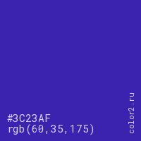 Цвет #3C23AF в цветовой модели RGB обозначается тремя октетами (60, 35, 175) в десятичном формате и #3C23AF в шестнадцатиричном (hex) формате, которые являются интенсивностью красного 60 (hex 3C), интенсивность зелёного 35 (hex 23) и интенсивность синего 175 (hex AF).