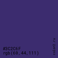 Цвет #3C2C6F в цветовой модели RGB обозначается тремя октетами (60, 44, 111) в десятичном формате и #3C2C6F в шестнадцатиричном (hex) формате, которые являются интенсивностью красного 60 (hex 3C), интенсивность зелёного 44 (hex 2C) и интенсивность синего 111 (hex 6F).