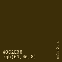 Цвет #3C2E08 в цветовой модели RGB обозначается тремя октетами (60, 46, 8) в десятичном формате и #3C2E08 в шестнадцатиричном (hex) формате, которые являются интенсивностью красного 60 (hex 3C), интенсивность зелёного 46 (hex 2E) и интенсивность синего 8 (hex 08).