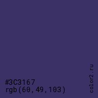 Цвет #3C3167 в цветовой модели RGB обозначается тремя октетами (60, 49, 103) в десятичном формате и #3C3167 в шестнадцатиричном (hex) формате, которые являются интенсивностью красного 60 (hex 3C), интенсивность зелёного 49 (hex 31) и интенсивность синего 103 (hex 67).