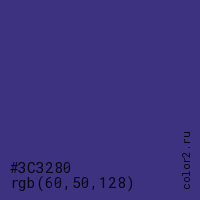Цвет #3C3280 в цветовой модели RGB обозначается тремя октетами (60, 50, 128) в десятичном формате и #3C3280 в шестнадцатиричном (hex) формате, которые являются интенсивностью красного 60 (hex 3C), интенсивность зелёного 50 (hex 32) и интенсивность синего 128 (hex 80).