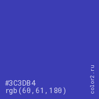 Цвет #3C3DB4 в цветовой модели RGB обозначается тремя октетами (60, 61, 180) в десятичном формате и #3C3DB4 в шестнадцатиричном (hex) формате, которые являются интенсивностью красного 60 (hex 3C), интенсивность зелёного 61 (hex 3D) и интенсивность синего 180 (hex B4).