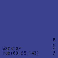 Цвет #3C418F в цветовой модели RGB обозначается тремя октетами (60, 65, 143) в десятичном формате и #3C418F в шестнадцатиричном (hex) формате, которые являются интенсивностью красного 60 (hex 3C), интенсивность зелёного 65 (hex 41) и интенсивность синего 143 (hex 8F).