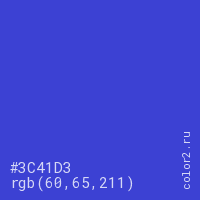 Цвет #3C41D3 в цветовой модели RGB обозначается тремя октетами (60, 65, 211) в десятичном формате и #3C41D3 в шестнадцатиричном (hex) формате, которые являются интенсивностью красного 60 (hex 3C), интенсивность зелёного 65 (hex 41) и интенсивность синего 211 (hex D3).