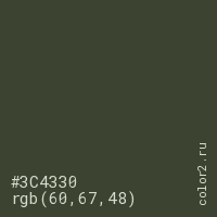 Цвет #3C4330 в цветовой модели RGB обозначается тремя октетами (60, 67, 48) в десятичном формате и #3C4330 в шестнадцатиричном (hex) формате, которые являются интенсивностью красного 60 (hex 3C), интенсивность зелёного 67 (hex 43) и интенсивность синего 48 (hex 30).