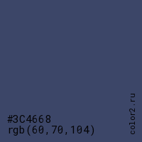 Цвет #3C4668 в цветовой модели RGB обозначается тремя октетами (60, 70, 104) в десятичном формате и #3C4668 в шестнадцатиричном (hex) формате, которые являются интенсивностью красного 60 (hex 3C), интенсивность зелёного 70 (hex 46) и интенсивность синего 104 (hex 68).