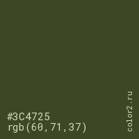 Цвет #3C4725 в цветовой модели RGB обозначается тремя октетами (60, 71, 37) в десятичном формате и #3C4725 в шестнадцатиричном (hex) формате, которые являются интенсивностью красного 60 (hex 3C), интенсивность зелёного 71 (hex 47) и интенсивность синего 37 (hex 25).