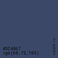 Цвет #3C4867 в цветовой модели RGB обозначается тремя октетами (60, 72, 103) в десятичном формате и #3C4867 в шестнадцатиричном (hex) формате, которые являются интенсивностью красного 60 (hex 3C), интенсивность зелёного 72 (hex 48) и интенсивность синего 103 (hex 67).