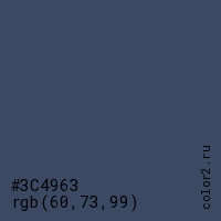Цвет #3C4963 в цветовой модели RGB обозначается тремя октетами (60, 73, 99) в десятичном формате и #3C4963 в шестнадцатиричном (hex) формате, которые являются интенсивностью красного 60 (hex 3C), интенсивность зелёного 73 (hex 49) и интенсивность синего 99 (hex 63).
