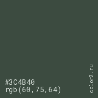 Цвет #3C4B40 в цветовой модели RGB обозначается тремя октетами (60, 75, 64) в десятичном формате и #3C4B40 в шестнадцатиричном (hex) формате, которые являются интенсивностью красного 60 (hex 3C), интенсивность зелёного 75 (hex 4B) и интенсивность синего 64 (hex 40).