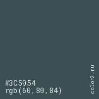 Цвет #3C5054 в цветовой модели RGB обозначается тремя октетами (60, 80, 84) в десятичном формате и #3C5054 в шестнадцатиричном (hex) формате, которые являются интенсивностью красного 60 (hex 3C), интенсивность зелёного 80 (hex 50) и интенсивность синего 84 (hex 54).