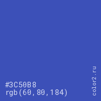 Цвет #3C50B8 в цветовой модели RGB обозначается тремя октетами (60, 80, 184) в десятичном формате и #3C50B8 в шестнадцатиричном (hex) формате, которые являются интенсивностью красного 60 (hex 3C), интенсивность зелёного 80 (hex 50) и интенсивность синего 184 (hex B8).