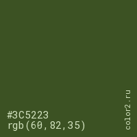 Цвет #3C5223 в цветовой модели RGB обозначается тремя октетами (60, 82, 35) в десятичном формате и #3C5223 в шестнадцатиричном (hex) формате, которые являются интенсивностью красного 60 (hex 3C), интенсивность зелёного 82 (hex 52) и интенсивность синего 35 (hex 23).