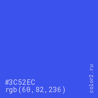 Цвет #3C52EC в цветовой модели RGB обозначается тремя октетами (60, 82, 236) в десятичном формате и #3C52EC в шестнадцатиричном (hex) формате, которые являются интенсивностью красного 60 (hex 3C), интенсивность зелёного 82 (hex 52) и интенсивность синего 236 (hex EC).