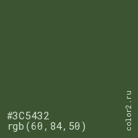 Цвет #3C5432 в цветовой модели RGB обозначается тремя октетами (60, 84, 50) в десятичном формате и #3C5432 в шестнадцатиричном (hex) формате, которые являются интенсивностью красного 60 (hex 3C), интенсивность зелёного 84 (hex 54) и интенсивность синего 50 (hex 32).