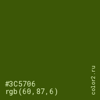 Цвет #3C5706 в цветовой модели RGB обозначается тремя октетами (60, 87, 6) в десятичном формате и #3C5706 в шестнадцатиричном (hex) формате, которые являются интенсивностью красного 60 (hex 3C), интенсивность зелёного 87 (hex 57) и интенсивность синего 6 (hex 06).