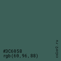 Цвет #3C6058 в цветовой модели RGB обозначается тремя октетами (60, 96, 88) в десятичном формате и #3C6058 в шестнадцатиричном (hex) формате, которые являются интенсивностью красного 60 (hex 3C), интенсивность зелёного 96 (hex 60) и интенсивность синего 88 (hex 58).