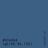Цвет #3C6084 в цветовой модели RGB обозначается тремя октетами (60, 96, 132) в десятичном формате и #3C6084 в шестнадцатиричном (hex) формате, которые являются интенсивностью красного 60 (hex 3C), интенсивность зелёного 96 (hex 60) и интенсивность синего 132 (hex 84).