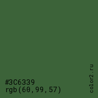 Цвет #3C6339 в цветовой модели RGB обозначается тремя октетами (60, 99, 57) в десятичном формате и #3C6339 в шестнадцатиричном (hex) формате, которые являются интенсивностью красного 60 (hex 3C), интенсивность зелёного 99 (hex 63) и интенсивность синего 57 (hex 39).