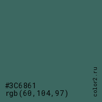 Цвет #3C6861 в цветовой модели RGB обозначается тремя октетами (60, 104, 97) в десятичном формате и #3C6861 в шестнадцатиричном (hex) формате, которые являются интенсивностью красного 60 (hex 3C), интенсивность зелёного 104 (hex 68) и интенсивность синего 97 (hex 61).