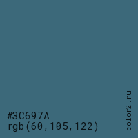 Цвет #3C697A в цветовой модели RGB обозначается тремя октетами (60, 105, 122) в десятичном формате и #3C697A в шестнадцатиричном (hex) формате, которые являются интенсивностью красного 60 (hex 3C), интенсивность зелёного 105 (hex 69) и интенсивность синего 122 (hex 7A).