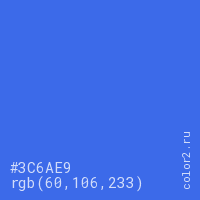 Цвет #3C6AE9 в цветовой модели RGB обозначается тремя октетами (60, 106, 233) в десятичном формате и #3C6AE9 в шестнадцатиричном (hex) формате, которые являются интенсивностью красного 60 (hex 3C), интенсивность зелёного 106 (hex 6A) и интенсивность синего 233 (hex E9).