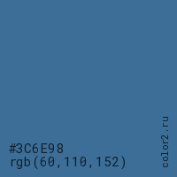 Цвет #3C6E98 в цветовой модели RGB обозначается тремя октетами (60, 110, 152) в десятичном формате и #3C6E98 в шестнадцатиричном (hex) формате, которые являются интенсивностью красного 60 (hex 3C), интенсивность зелёного 110 (hex 6E) и интенсивность синего 152 (hex 98).