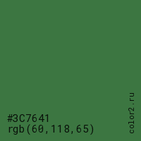Цвет #3C7641 в цветовой модели RGB обозначается тремя октетами (60, 118, 65) в десятичном формате и #3C7641 в шестнадцатиричном (hex) формате, которые являются интенсивностью красного 60 (hex 3C), интенсивность зелёного 118 (hex 76) и интенсивность синего 65 (hex 41).