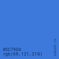 Цвет #3C79DA в цветовой модели RGB обозначается тремя октетами (60, 121, 218) в десятичном формате и #3C79DA в шестнадцатиричном (hex) формате, которые являются интенсивностью красного 60 (hex 3C), интенсивность зелёного 121 (hex 79) и интенсивность синего 218 (hex DA).