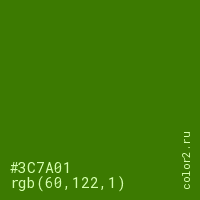 Цвет #3C7A01 в цветовой модели RGB обозначается тремя октетами (60, 122, 1) в десятичном формате и #3C7A01 в шестнадцатиричном (hex) формате, которые являются интенсивностью красного 60 (hex 3C), интенсивность зелёного 122 (hex 7A) и интенсивность синего 1 (hex 01).