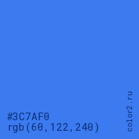 Цвет #3C7AF0 в цветовой модели RGB обозначается тремя октетами (60, 122, 240) в десятичном формате и #3C7AF0 в шестнадцатиричном (hex) формате, которые являются интенсивностью красного 60 (hex 3C), интенсивность зелёного 122 (hex 7A) и интенсивность синего 240 (hex F0).