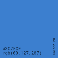 Цвет #3C7FCF в цветовой модели RGB обозначается тремя октетами (60, 127, 207) в десятичном формате и #3C7FCF в шестнадцатиричном (hex) формате, которые являются интенсивностью красного 60 (hex 3C), интенсивность зелёного 127 (hex 7F) и интенсивность синего 207 (hex CF).