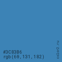 Цвет #3C83B6 в цветовой модели RGB обозначается тремя октетами (60, 131, 182) в десятичном формате и #3C83B6 в шестнадцатиричном (hex) формате, которые являются интенсивностью красного 60 (hex 3C), интенсивность зелёного 131 (hex 83) и интенсивность синего 182 (hex B6).