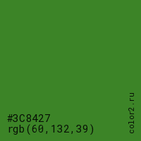 Цвет #3C8427 в цветовой модели RGB обозначается тремя октетами (60, 132, 39) в десятичном формате и #3C8427 в шестнадцатиричном (hex) формате, которые являются интенсивностью красного 60 (hex 3C), интенсивность зелёного 132 (hex 84) и интенсивность синего 39 (hex 27).