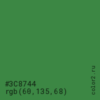 Цвет #3C8744 в цветовой модели RGB обозначается тремя октетами (60, 135, 68) в десятичном формате и #3C8744 в шестнадцатиричном (hex) формате, которые являются интенсивностью красного 60 (hex 3C), интенсивность зелёного 135 (hex 87) и интенсивность синего 68 (hex 44).