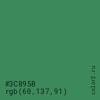 Цвет #3C895B в цветовой модели RGB обозначается тремя октетами (60, 137, 91) в десятичном формате и #3C895B в шестнадцатиричном (hex) формате, которые являются интенсивностью красного 60 (hex 3C), интенсивность зелёного 137 (hex 89) и интенсивность синего 91 (hex 5B).