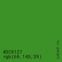 Цвет #3C9127 в цветовой модели RGB обозначается тремя октетами (60, 145, 39) в десятичном формате и #3C9127 в шестнадцатиричном (hex) формате, которые являются интенсивностью красного 60 (hex 3C), интенсивность зелёного 145 (hex 91) и интенсивность синего 39 (hex 27).