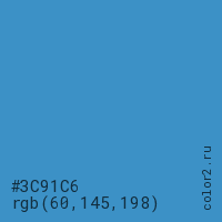 Цвет #3C91C6 в цветовой модели RGB обозначается тремя октетами (60, 145, 198) в десятичном формате и #3C91C6 в шестнадцатиричном (hex) формате, которые являются интенсивностью красного 60 (hex 3C), интенсивность зелёного 145 (hex 91) и интенсивность синего 198 (hex C6).