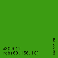 Цвет #3C9C12 в цветовой модели RGB обозначается тремя октетами (60, 156, 18) в десятичном формате и #3C9C12 в шестнадцатиричном (hex) формате, которые являются интенсивностью красного 60 (hex 3C), интенсивность зелёного 156 (hex 9C) и интенсивность синего 18 (hex 12).