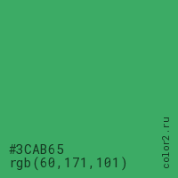 Цвет #3CAB65 в цветовой модели RGB обозначается тремя октетами (60, 171, 101) в десятичном формате и #3CAB65 в шестнадцатиричном (hex) формате, которые являются интенсивностью красного 60 (hex 3C), интенсивность зелёного 171 (hex AB) и интенсивность синего 101 (hex 65).