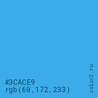 Цвет #3CACE9 в цветовой модели RGB обозначается тремя октетами (60, 172, 233) в десятичном формате и #3CACE9 в шестнадцатиричном (hex) формате, которые являются интенсивностью красного 60 (hex 3C), интенсивность зелёного 172 (hex AC) и интенсивность синего 233 (hex E9).