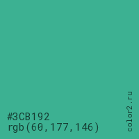 Цвет #3CB192 в цветовой модели RGB обозначается тремя октетами (60, 177, 146) в десятичном формате и #3CB192 в шестнадцатиричном (hex) формате, которые являются интенсивностью красного 60 (hex 3C), интенсивность зелёного 177 (hex B1) и интенсивность синего 146 (hex 92).