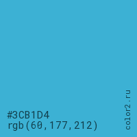 Цвет #3CB1D4 в цветовой модели RGB обозначается тремя октетами (60, 177, 212) в десятичном формате и #3CB1D4 в шестнадцатиричном (hex) формате, которые являются интенсивностью красного 60 (hex 3C), интенсивность зелёного 177 (hex B1) и интенсивность синего 212 (hex D4).