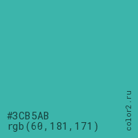 Цвет #3CB5AB в цветовой модели RGB обозначается тремя октетами (60, 181, 171) в десятичном формате и #3CB5AB в шестнадцатиричном (hex) формате, которые являются интенсивностью красного 60 (hex 3C), интенсивность зелёного 181 (hex B5) и интенсивность синего 171 (hex AB).