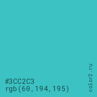 Цвет #3CC2C3 в цветовой модели RGB обозначается тремя октетами (60, 194, 195) в десятичном формате и #3CC2C3 в шестнадцатиричном (hex) формате, которые являются интенсивностью красного 60 (hex 3C), интенсивность зелёного 194 (hex C2) и интенсивность синего 195 (hex C3).