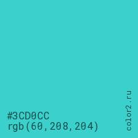 Цвет #3CD0CC в цветовой модели RGB обозначается тремя октетами (60, 208, 204) в десятичном формате и #3CD0CC в шестнадцатиричном (hex) формате, которые являются интенсивностью красного 60 (hex 3C), интенсивность зелёного 208 (hex D0) и интенсивность синего 204 (hex CC).
